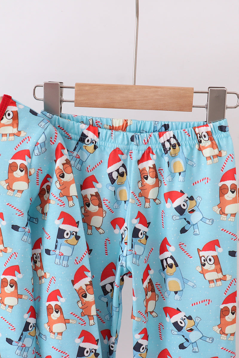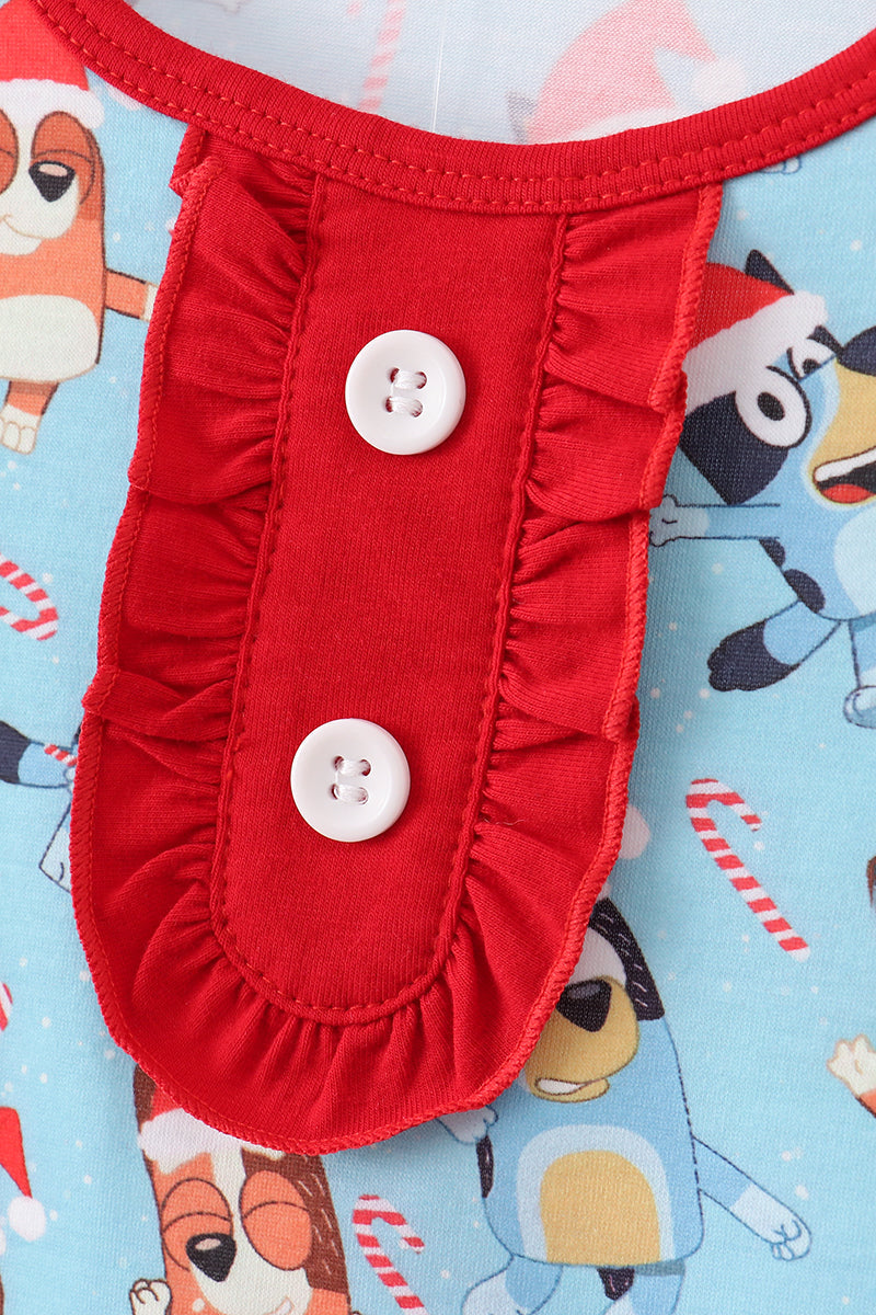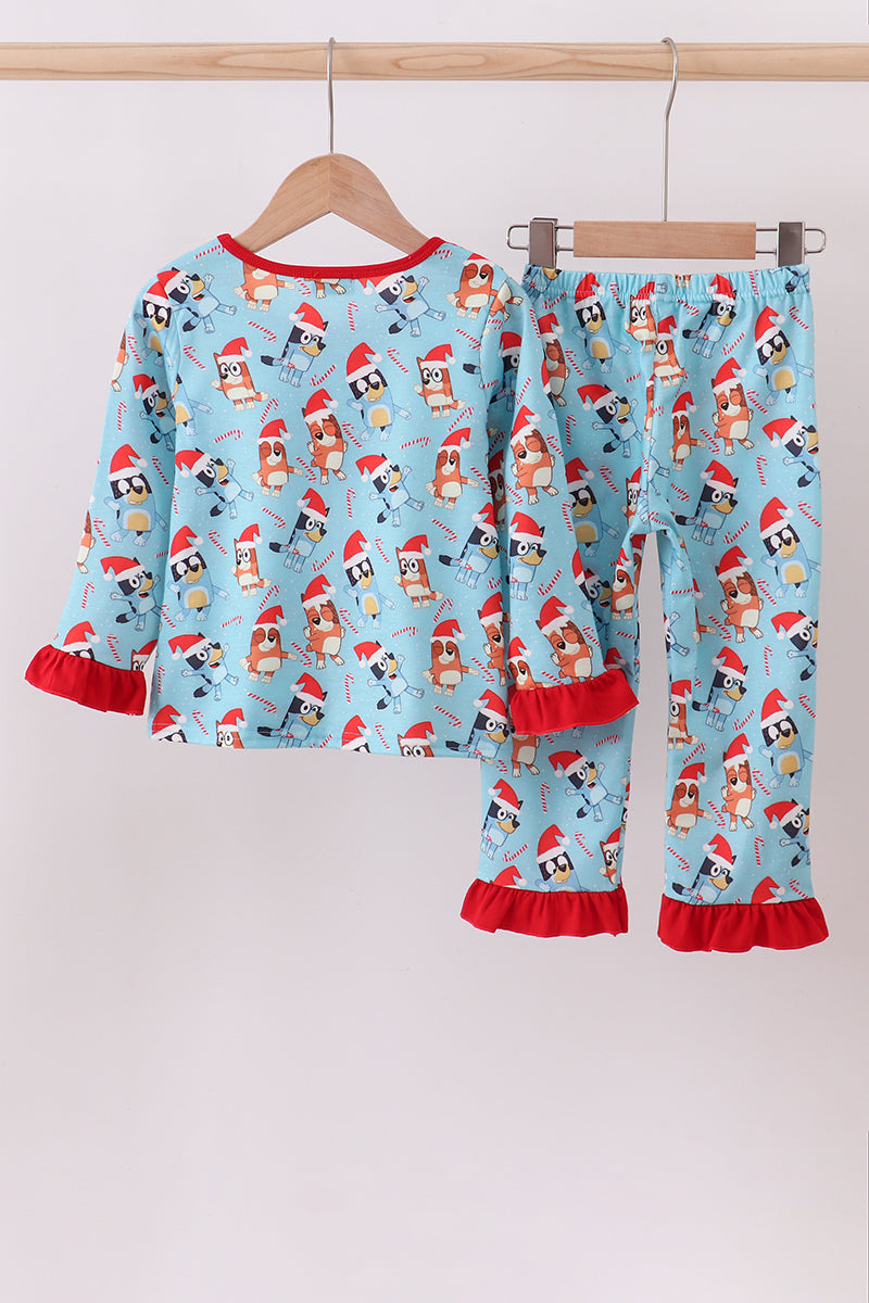 BLUE CHRISTMAS CHARACTER PRINT RUFFLE PAJAMAS SET