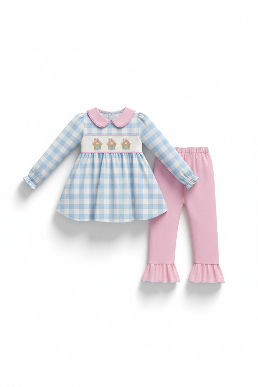 This charming blue gingham pants set features playful gingerbread house embroidery that adds a festive touch. The cute ruffle details on the pants make it perfect for little ones to twirl in, creating a fun and cheerful look for any occasion. Cozy and stylish, this set brings a splash of whimsy to your child’s wardrobe.