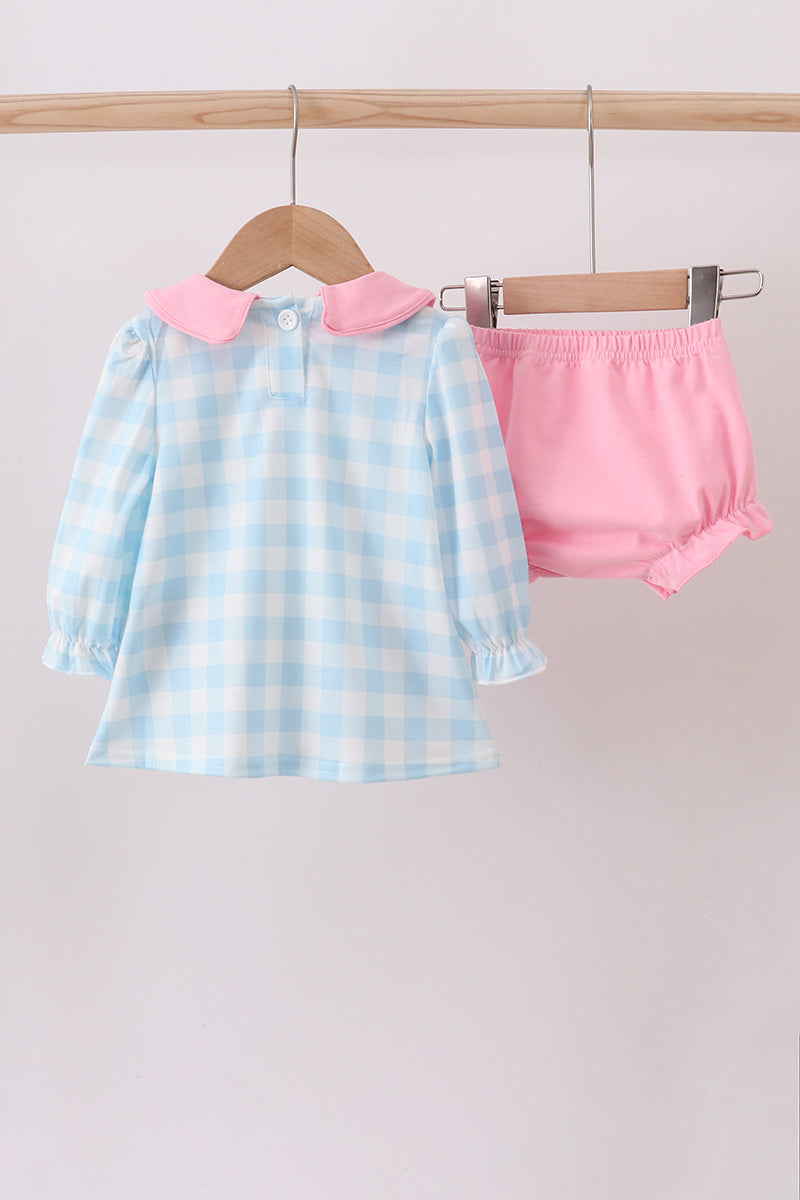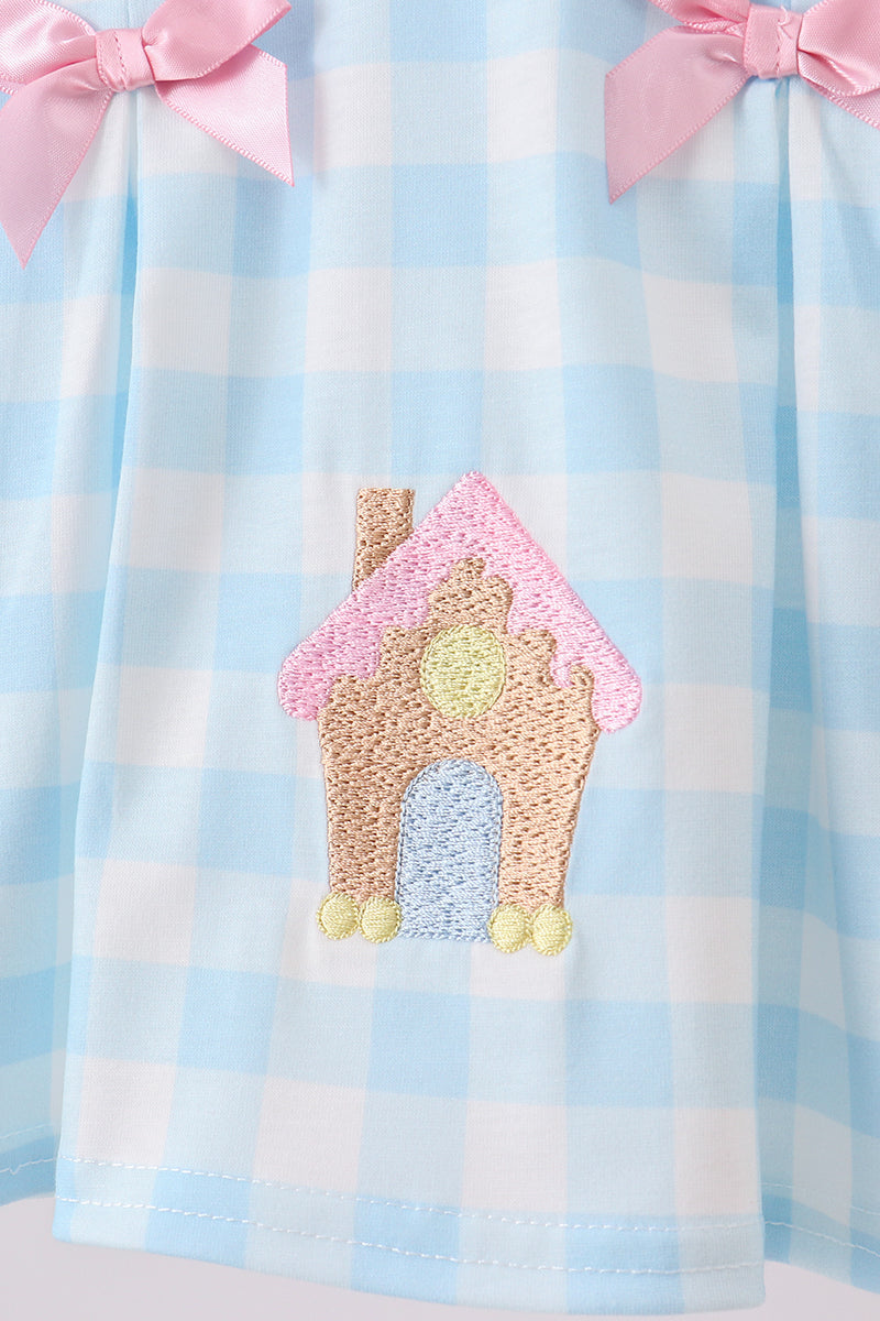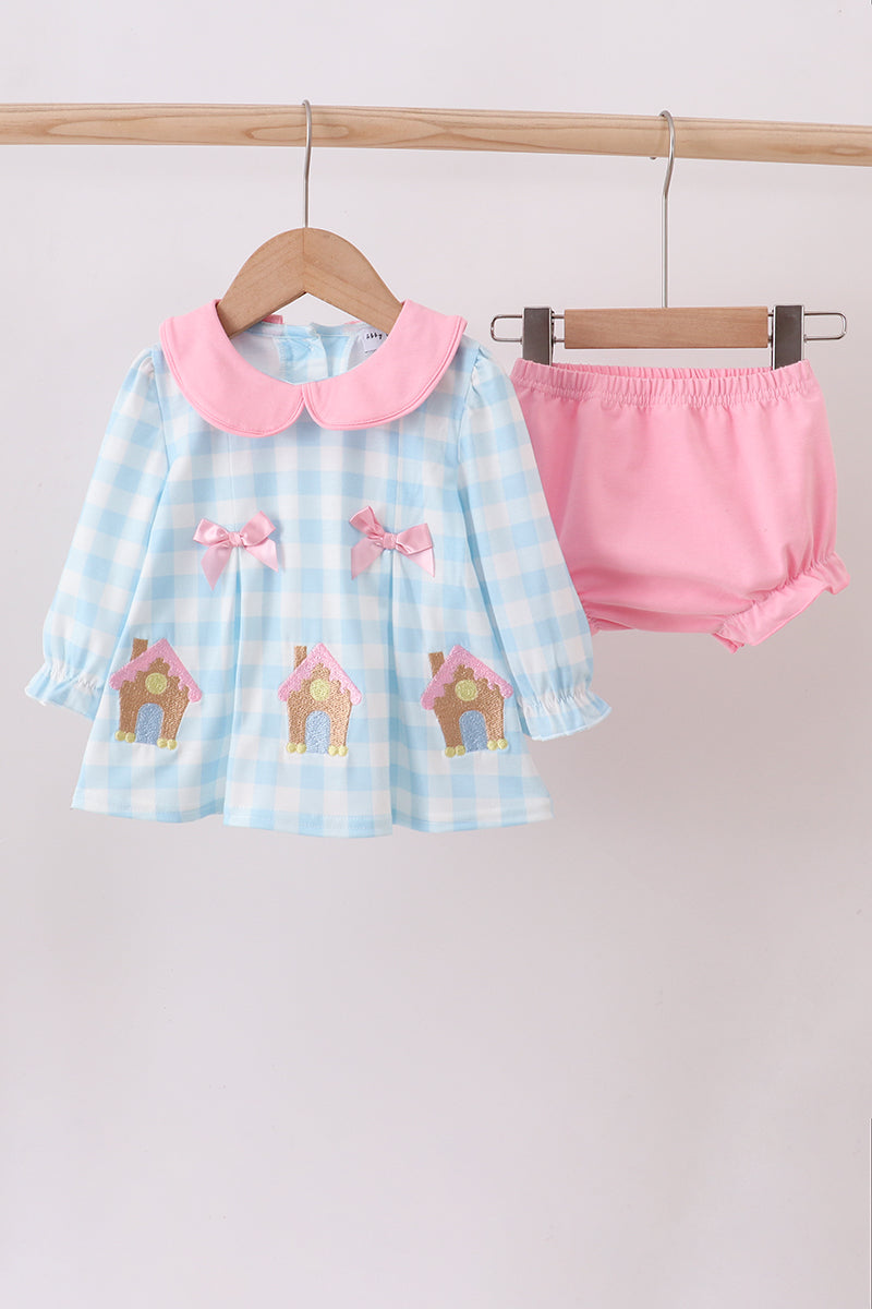 BLUE GINGERBREAD HOUSE EMBROIDERY RUFFLE GINGHAM BLOOMER SET